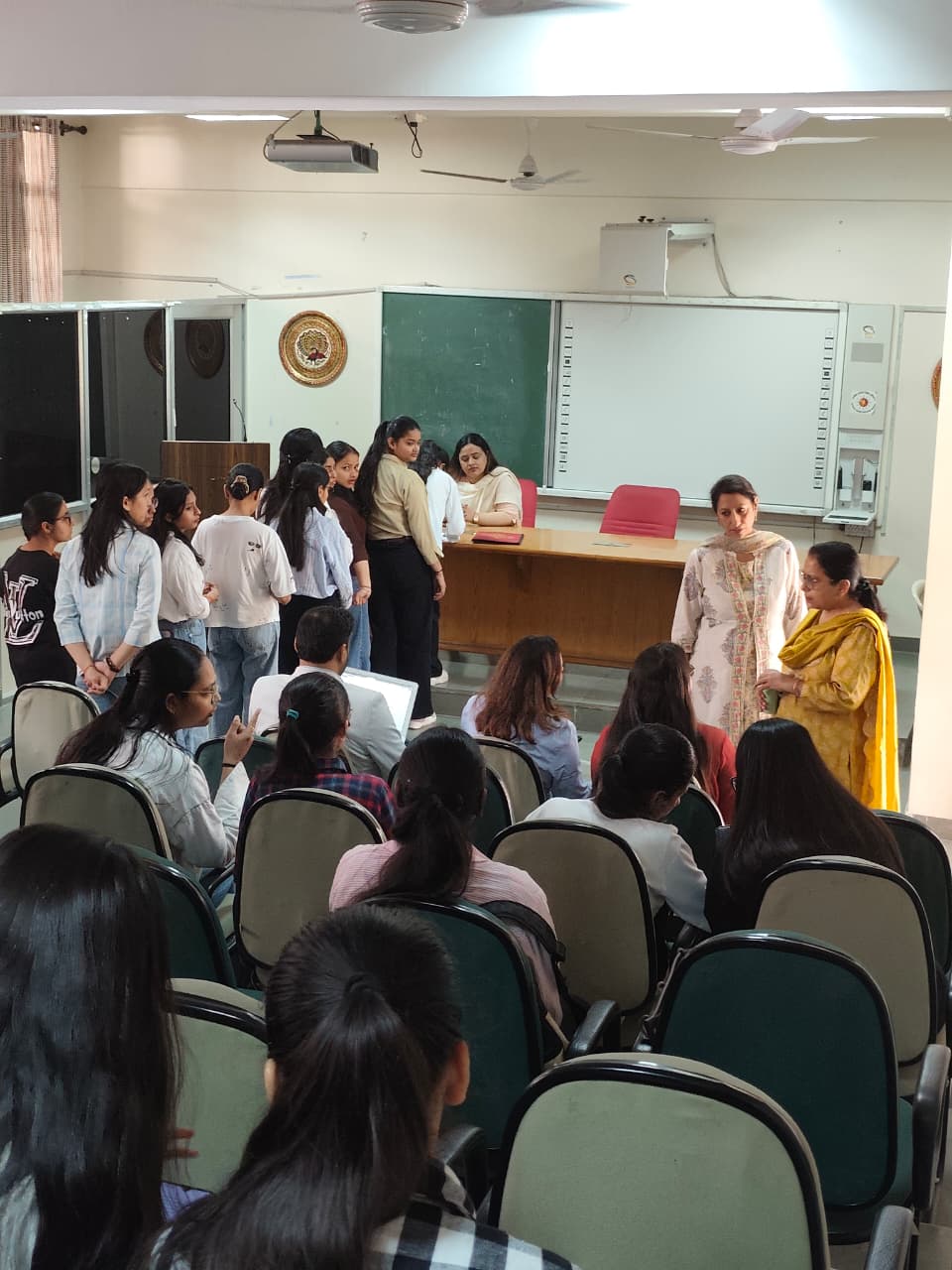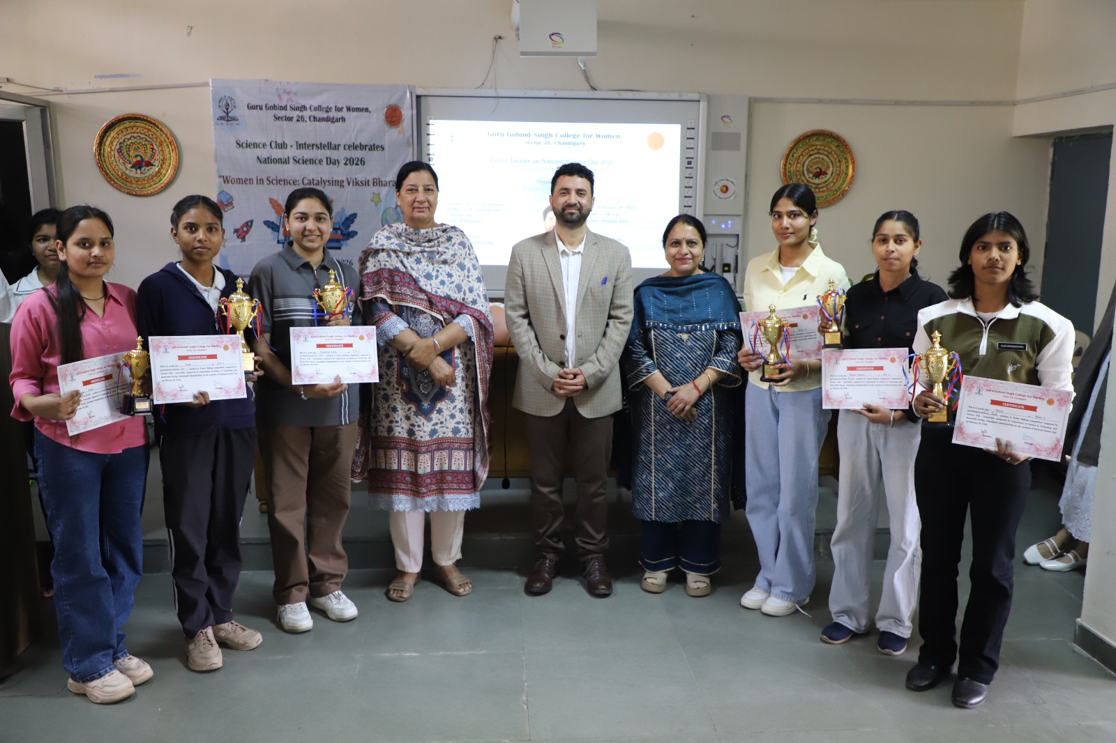 The Department of Science, GGSCW, under the sponsorship of the Department of Science & Technology and Renewable Energy, Chandigarh Administration, celebrated National Science Day on 28th February, 2026. The theme of the celebration was "Women in Science: Catalysing Viksit Bharat. On this occasion, an expert lecture on the topic " Global Science for Global Well Being” was delivered by Dr Lovish Dhiman, MBBS, DNB, Anaesthesia & Critical Care, Govt of Haryana in which many crucial health matters with special focus on women health were discussed. As part of the event, a poster making competition was also organized where students showcased their creativity on the topic “Sustainable future for India”.The winners were awarded certificates and trophies by Principal Dr Jatinder Kaur.